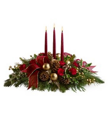 This sumptuous centerpiece will grace any holiday table. Red carnations, golden ornaments, pinecones, ribbons and more surround three tall red tapers to create a vision of splendor.