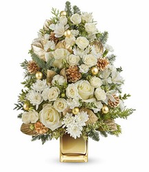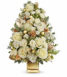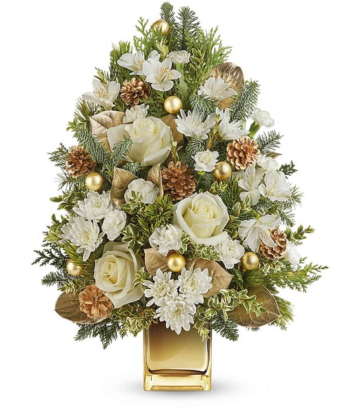 Enhance your holiday with a touch of elegance in this beautifully understated tree bouquet featuring white roses in a gold mirrored cube. Perfect for celebrating a sparkling white Christmas.